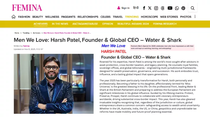 Water & Shark is proud to share that our Founder & Global CEO, Harsh Patel, has been featured in Femina’s Men We Love 2025, recognizing influential leaders shaping global business, governance, and cross-border strategy.